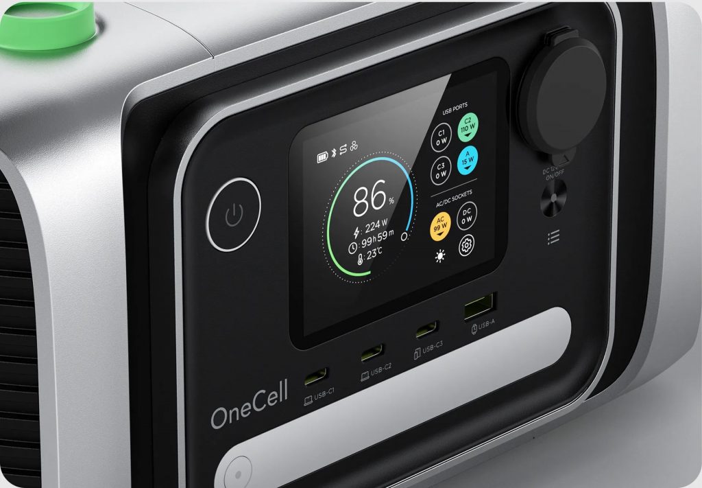 L’unità può essere ricaricata tramite USB Type-C utilizzando un alimentatore compatibile, oltre che tramite pannelli solari, un vantaggio per il campeggio e l’uso off-grid. La ricarica da rete raggiunge fino a 240 watt via USB Type-C o 300 watt tramite presa AC, mentre la ricarica solare è più limitata, con un massimo di 110 watt.